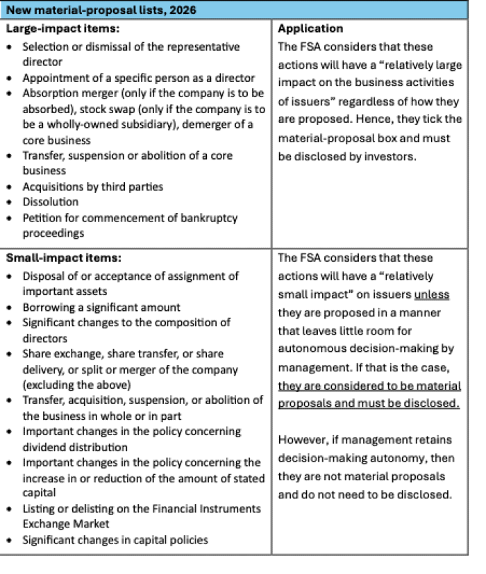 What is changing is potentially far reaching. From May 2026, investors will enjoy considerably more scope to engage companies and exercise their rights without triggering a reporting obligation. To simplify, the list of material proposals is now divided into matters likely to have a "relatively large impact on the business activities of the issuer" (and must be disclosed) and those described as having only a "relatively small impact" (and need not be disclosed).